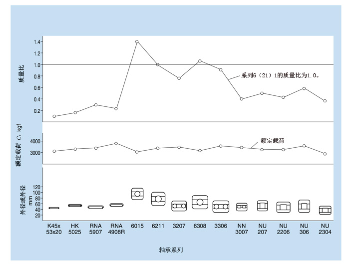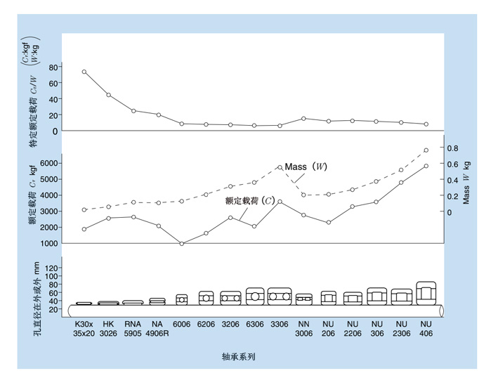 下圖比較了直徑為(30)mm的軸承。滾針軸承每給定質量的承載能力是其他軸承類型的2到8倍。
