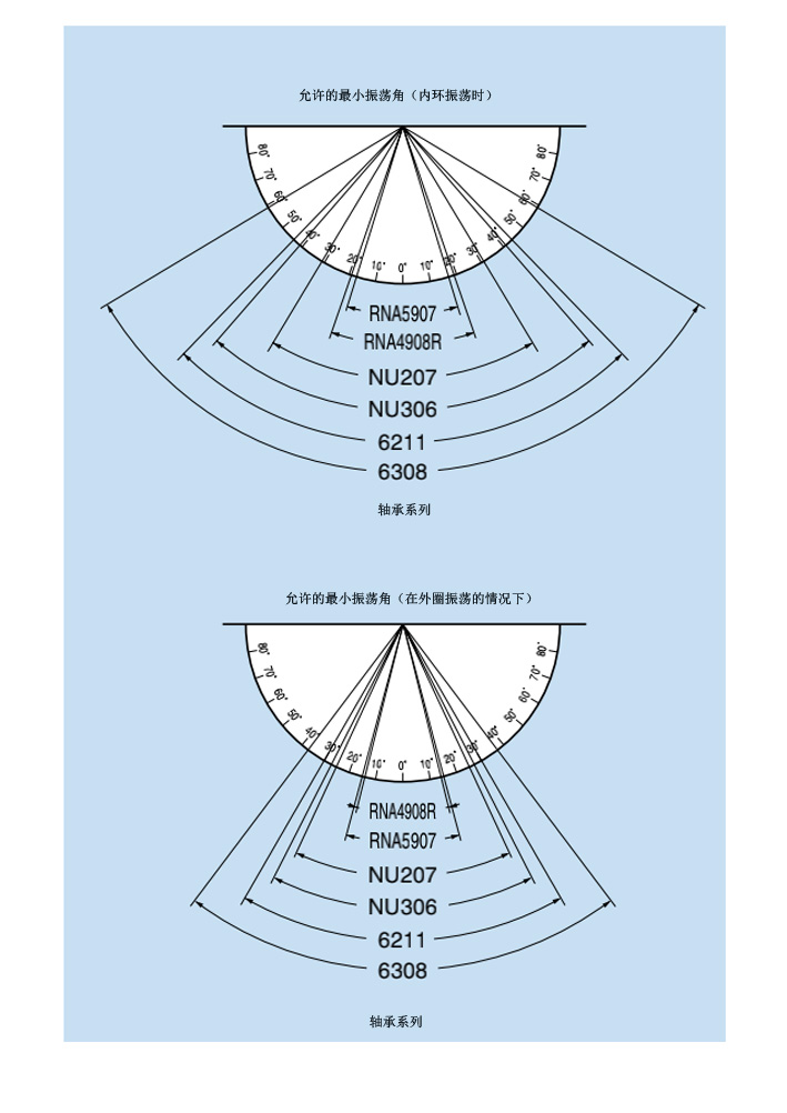 這種設計確保了相鄰滾柱的良好潤滑,因為潤滑劑被擠出滾柱并防止其磨損。圖下顯示了內圈和外圈的最小振蕩角。這是增加一排輥子數量和確保最小振動角的最有效方法。因此,滾針軸承最適合此用途。