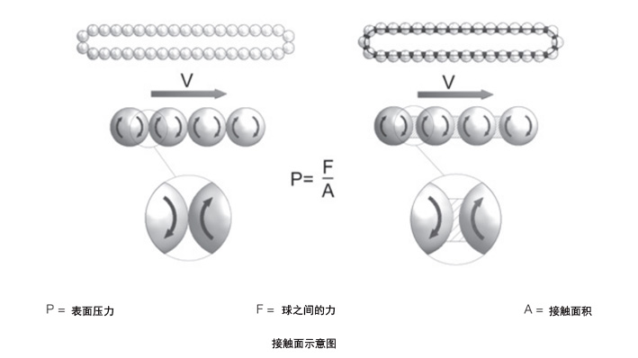 傳統(tǒng)線性導(dǎo)軌中的旋轉(zhuǎn)球彼此之間有點(diǎn)接觸。接觸點(diǎn)的旋轉(zhuǎn)速度是球速度的兩倍。接觸面積(A)非常小,以至于表面壓力(P)趨于無(wú)窮大。這會(huì)導(dǎo)致鋼球和線性導(dǎo)向系統(tǒng)發(fā)熱和磨損。帶有滾珠鏈的直線導(dǎo)軌中的鏈條具有保持架的功能。防止球之間的接觸。球和鏈條也有相對(duì)較大的接觸面積(a),這會(huì)顯著降低表面壓力(P)。滾珠和鏈條接觸面處的轉(zhuǎn)速相應(yīng)。球鏈還用于輸送潤(rùn)滑劑,并在球上形成潤(rùn)滑膜。托架的設(shè)計(jì)允許從潤(rùn)滑油接頭向球鏈的循環(huán)區(qū)域有效供應(yīng)潤(rùn)滑油(如下圖)。