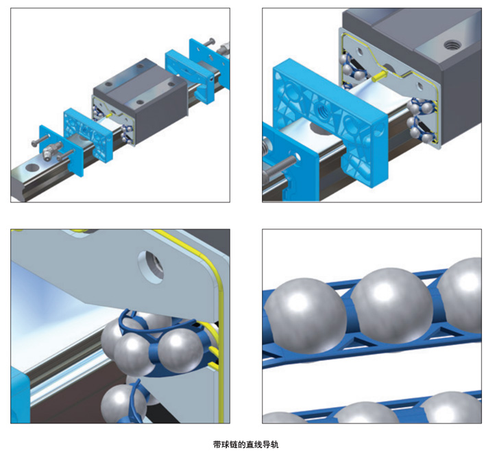 用于引導(dǎo)滾動(dòng)元件的保持架已經(jīng)在滾柱軸承中使用了100多年,也是新開(kāi)發(fā)的線性導(dǎo)軌的一部分。帶球鏈的線性導(dǎo)軌與傳統(tǒng)系列的不同之處在于: