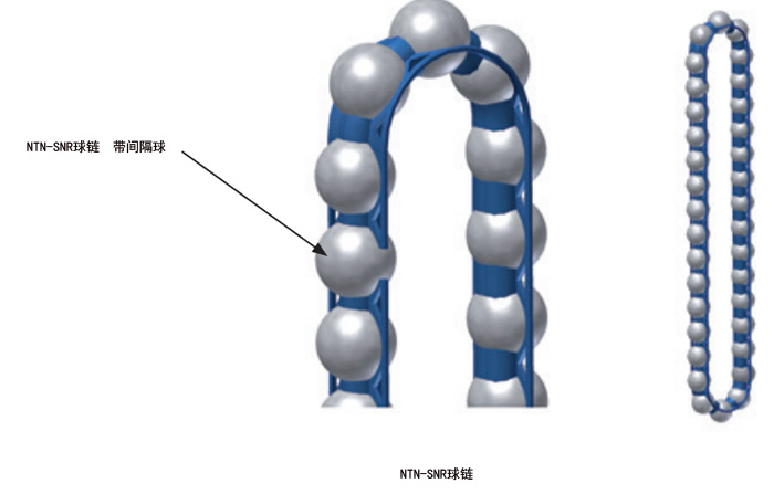 帶有滾珠鏈的直線導(dǎo)軌中的鏈條具有保持架的功能。它使球彼此保持恒定的距離,并控制它們的循環(huán)。車廂的結(jié)構(gòu)使其不可能實(shí)現(xiàn)封閉的球鏈循環(huán)。在球鏈的末端,保留約1個(gè)球直徑的空間。NTN-SNR球鏈末端的設(shè)計(jì)和間隔球的使用彌補(bǔ)了這一空間(如下圖)。
