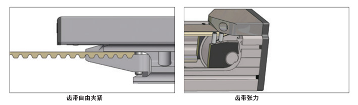 齒形皮帶通過齒段夾緊的特殊設計(如下圖左)允許齒帶自由夾緊。