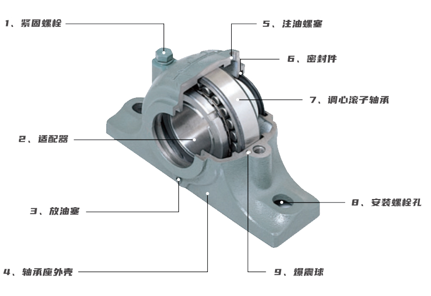 七、調心滾子軸承。軸承座內部安裝的軸承,一般使用調心滾子軸承,是軸承座的核心,具體作用自無需贅述。
