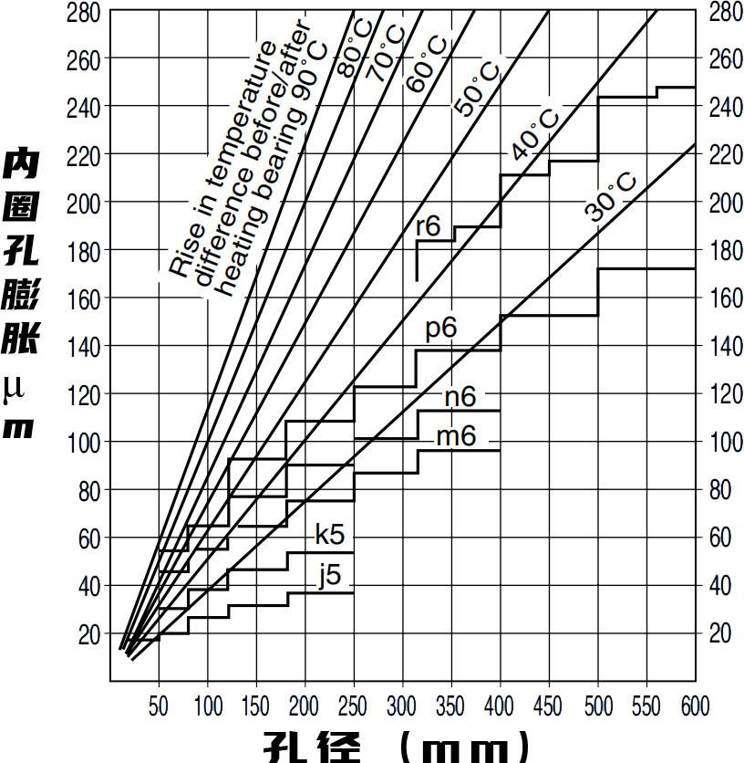 在任何一種情況下,開始安裝時都要小心軸承不會錯位。如果內(nèi)圈過盈量較大,軸承一般會加熱,使內(nèi)圈膨脹,很容易插入軸上,根據(jù)軸承孔溫差的膨脹量如下圖所示。