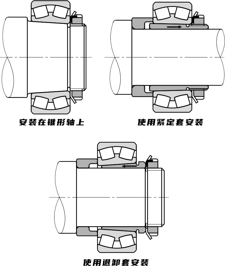 錐形軸或緊定套/退卸套筒用于具有錐形孔的小軸承,軸承用鎖緊螺母打入到位,如下圖所示。