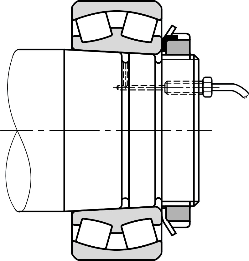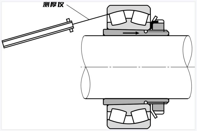 為了測量調(diào)心滾柱軸承的徑向內(nèi)部間隙,應(yīng)將滾子固定到正確的位置,并在沒有負載的滾子和外圈之間插入測厚儀,如下圖所示,此時,重要的是使用滾筒進行測量,也可以通過測量軸向驅(qū)動量而不是徑向內(nèi)部間隙減小量來獲得適當(dāng)?shù)母缮妗?br />