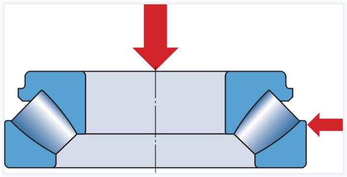 推力軸承承受主要沿軸軸線作用的載荷,根據其設計,推力軸承可在一個或兩個方向上承受純軸向載荷,如上圖所示,有些可額外承受徑向載荷,即組合載荷,如下圖所示,推力軸承轉速較慢,遠低于相同尺寸的徑向軸承。