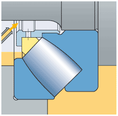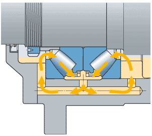 對于高轉(zhuǎn)速應用,建議使用帶機加工保持架的軸承,同時使用注油潤滑的方式,如上圖所示,對軸承進行持續(xù)注油潤滑,轉(zhuǎn)速高于泵送效應的油潤滑,發(fā)熱量也更低。