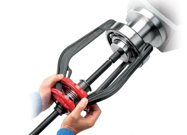 在更換軸承時,第一步是拆除出現故障的軸承,最好的選擇是使用拉拔器和壓力機,如上圖所示,使用拉拔器將軸承安全地拉出外圈,可以最大限度地減少對軸和殼體的損壞,并節省時間。