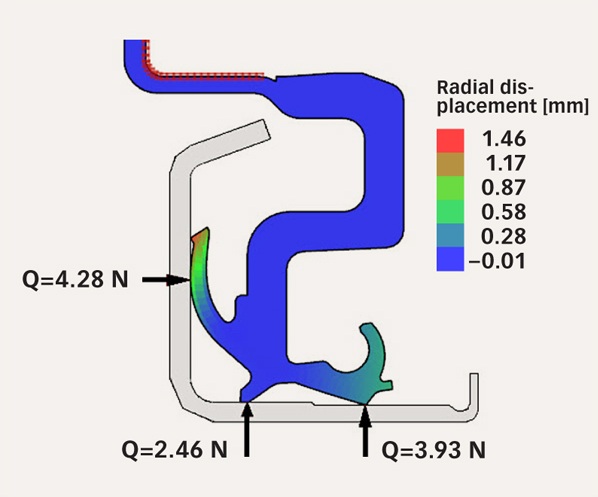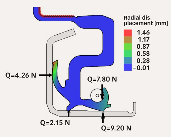 計(jì)算安裝在軸上的密封件的能力是一個(gè)附加功能,當(dāng)安裝密封件時(shí),它會(huì)在反表面上施加一個(gè)力,稱(chēng)為唇緣力,唇緣力是密封件在靜態(tài)和動(dòng)態(tài)操作條件下最重要的參數(shù)之一,唇緣力可確保所需的密封性,但也會(huì)導(dǎo)致唇緣下的密封摩擦,此外,當(dāng)密封材料老化時(shí),可以使用彈簧來(lái)保持足夠的密封唇力。因此,準(zhǔn)確預(yù)測(cè)不同操作條件下的唇緣力是模擬工具的關(guān)鍵要求,這將有助于減少設(shè)計(jì)迭代次數(shù),從而縮短新產(chǎn)品的上市時(shí)間。