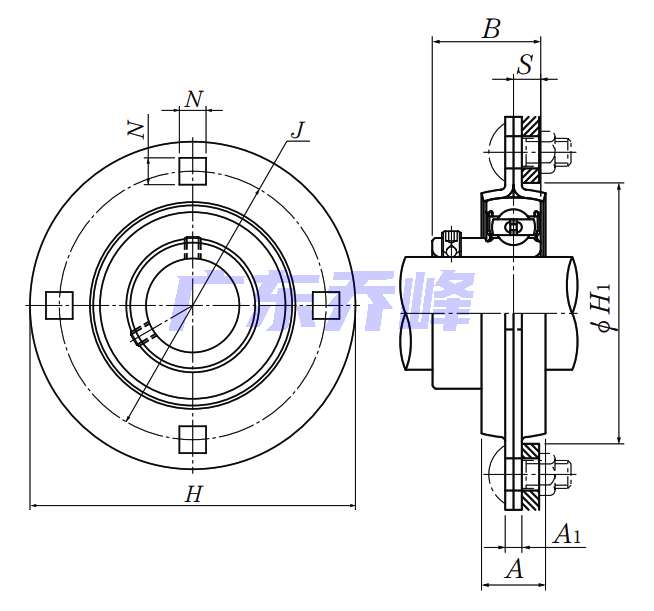 | 四螺栓圓形法蘭式軸承座,沖壓鋼外殼,帶緊定螺釘,ASPF型 - 尺寸 | |